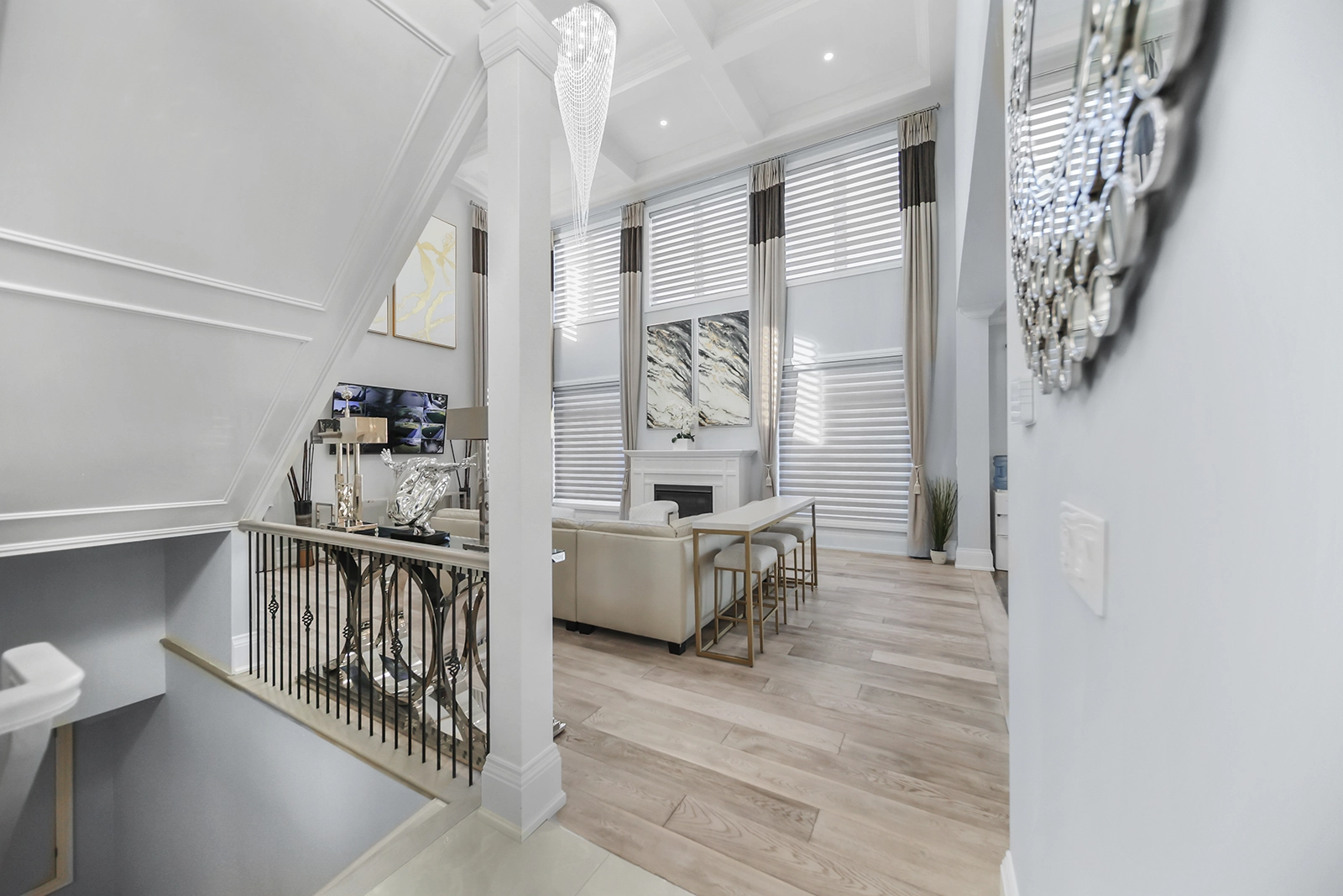 - Soaring 10' And 22" Ceilings with custom blinds, drapes, light fixtures and gas fireplace. Carpet-free flooring.